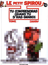 Ainsi, on peut penser que c’est la raison qui a poussé les Editions Dupuis à adopter la même stratégie … En effet, si certains d’entre vous ont pu voir l’affiche en librairie annonçant la sortie du N°10 du Petit Spirou, “tu comprendras quand tu s’ras grand !” (prévu pour fin Novembre 2001), ils n’auront pas pu en découvrir le dessin de couverture. La rasion : celui-ci est crypté, de telle sorte qu’il est impossible de savoir précisément ce qu’on bien pu imaginer cette fois-ci les fameux Tome et Janry ! Les affichent parlent de censure, histoire de monter un petit scénario justifiant ce cryptage inattendu. Bien sûr, il s’agit, à l’instar de la sortie d’Astérix, de susciter la curiosité du lecteur, qui, fort impatient, se précipitera dès le jour J venu afin de se procurer un exemplaire du précieux album !