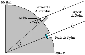 Ératosthène se trouvait alors à Alexandrie, située à environ 800 km au nord de Syène. Il a mesuré l'ombre projetée par un obélisque et a remarqué que les rayons du Soleil formaient un angle de 7,2 degrés par rapport à la verticale.